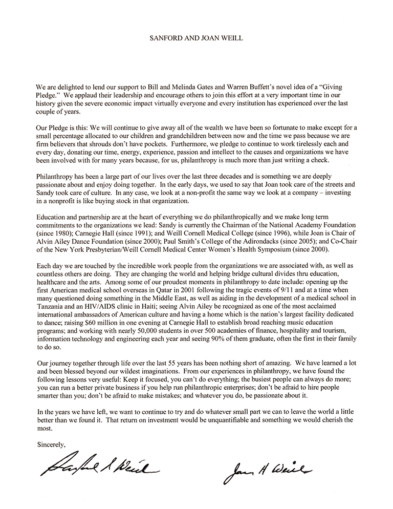 We are delighted to lend our support to Bill and Melinda Gates and Warren Buffett’s novel idea of a “Giving Pledge.” We applaud their leadership and encourage others to join this effort at a very important time in our history given the severe economic impact virtually everyone and every institution has experienced over the last couple of years.